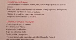 privind organizarea concursului pentru ocuparea funcției de Șef al Căminului Cultural din comuna Tohatin. Primăria comunei Tohatin anunță organizarea concursului pentru ocuparea funcției vacante de șef al Căminului Cultural din s.Tohatin. Condiții de participare: Studii superioare în domeniul culturii, artei, administrației publice sau domenii conexe; Experiență profesională în domeniu (constituie avantaj experiența managerială); Cunoașterea legislației în domeniul …