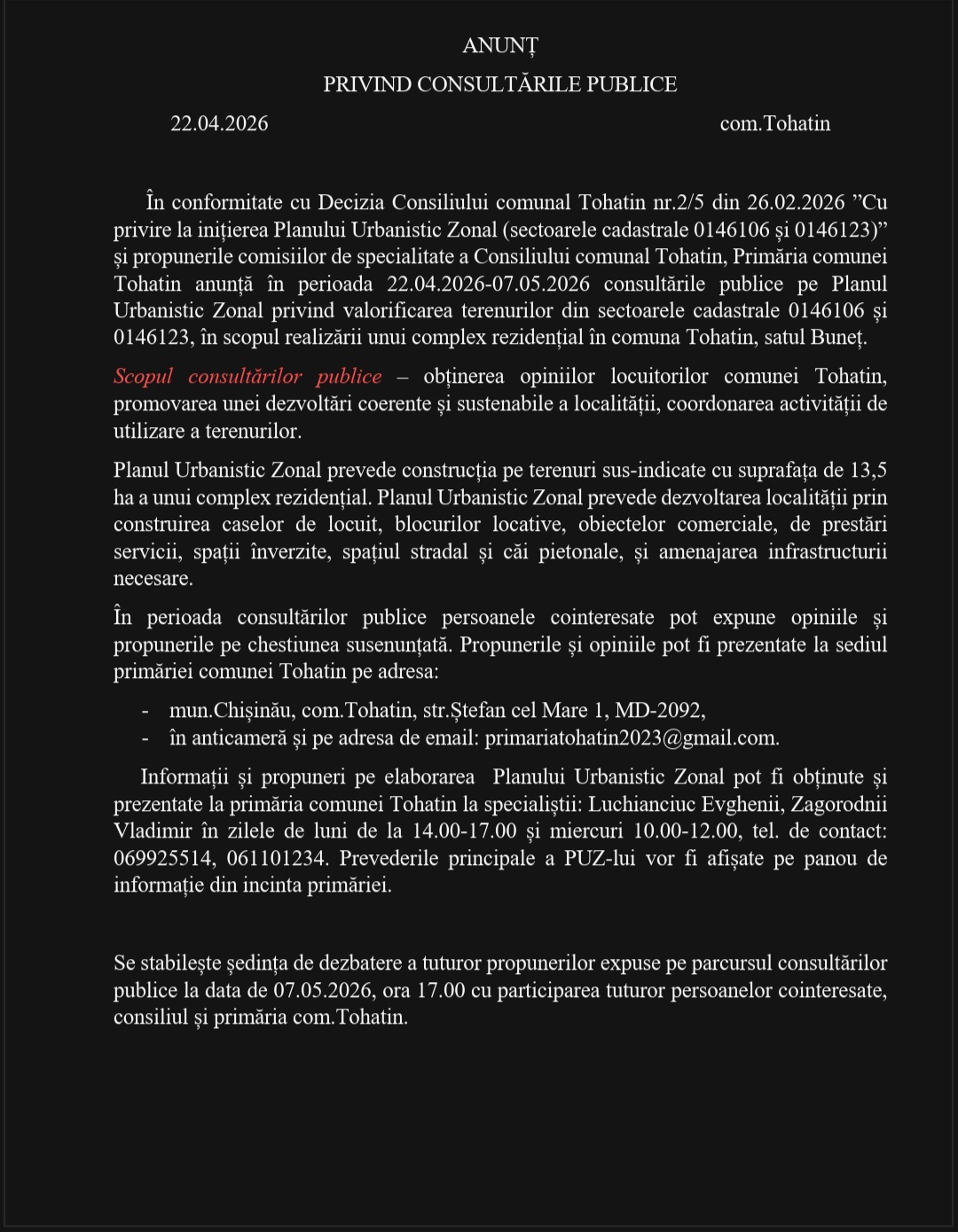 În conformitate cu Decizia Consiliului comunal Tohatin nr.2/5 din 26.02.2026 ”Cu privire la inițierea Planului Urbanistic Zonal (sectoarele cadastrale 0146106 și 0146123)” și propunerile comisiilor de specialitate a Consiliului comunal Tohatin, Primăria comunei Tohatin anunță în perioada 22.04.2026-07.05.2026 consultările publice pe Planul Urbanistic Zonal privind valorificarea terenurilor din sectoarele cadastrale 0146106 și 0146123, în scopul realizării unui complex rezidențial în comuna Tohatin, satul Buneț.