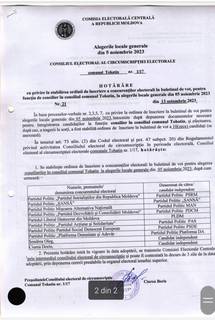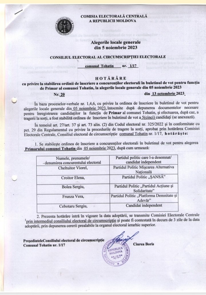Consiliul Electoral de Circumscripție Tohatin nr.1/17 prezinta Hotărârile privind concurenții electorali pentru alegerile locale generale din 05.11.2023