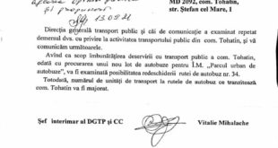 🏢 Primăria comunei Tohatin, roagă locuitorii comunei să se expună pe marginea răspunsului Direcției Generale Transport Public și Căi de Comunicație, referitor la redeschiderea circulației rutei de autobuz🚌 nr.34 și a graficului de circulație. 👉Sugestiile și propunerile le puteți adresa atît primăriei 🏢cit și în comentarii👇 pînă la data de 01.10.2021.