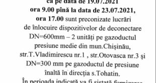 Se aduce la cunoștința locuitorilor despre sistarea furnizării apei pentru data de 08.06.2021,în intervalul de timp 09.00-24.00 în s.Buneți și s.Tohatin pe str-le: 💧Nucarilor 💧Renașterii 💧Livezilor 💧Teilor 💧Speranței 💧Nicolae Sulac 💧Independenței 💧Trandafirilor 💧Doga 💧Ciocîrliei 💧Cocorilor 💧Vieru 💧Sf.Parascheva 💧Ștefan cel Mare 💧Pădurilor
