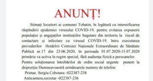 ANUNȚ! Stimați locuitori ai comunei Tohatin, în legătură cu intensificarea răspîndirii epidemiei virusului COVID-19, pentru evitarea expunerii populației și angajaților instituțiilor bugetare din teritoriu la riscul de contactare și infectare cu virusul COVID-19, întru executarea prevederilor Hotărîrii Comisiei Naționale Extraordinare de Sănătate Publică nr.17 din 23.06.2020, în perioada 01.07.2020-15.07.2020 primăria va activa în regim special, fără audiența fizică a …