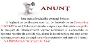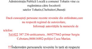 ANUNŢ În legătura cu situația epidimiologică privind Coronavirusul COVID-19, se solicită locuitorilor comunei Tohatin să se adreseze telefonic medicului de familie în caz de apariție a simptomelor de viroze însoțite de febră, tuse uscate și stare de respirație îngreunată. Deasemenea este necesar de informat serviciul medical din teritoriu în cazul contactelor cu persoane revenite din zonele afectate de Coronavirus …