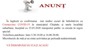 Întru combaterea răspîndirii virusului COVID-19 ,Administrația Publică Locală a dezinfectat locurile publice ( terenurile de joacă, stațiile transportului public, terenurile sportive, perimetrele instituțiilor publice). Administrația Publică Locală ,Vă îndeamnă să aveți grijă de sănătatea Dumneavoastră și a celor apropiați , respectați întocmai recomandările medicilor în situația de epidemie.